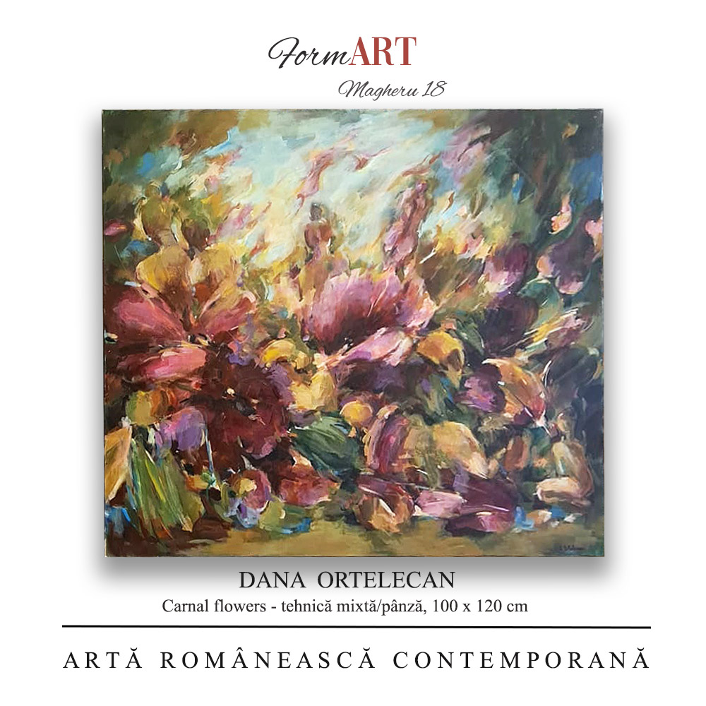 Dana Ortelecan – Carnal flowers, tehnică mixtă/pânză, dimensiuni 100 x 120 cm, lucrare originala, semnata.