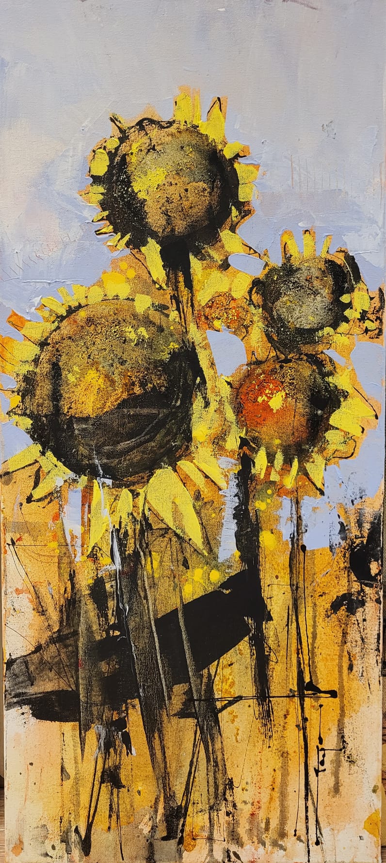 Mugur Popa – În lanul de floarea-soarelui, acril/pânză, dimensiuni 40 x 90 cm, lucrare originala, semnata.